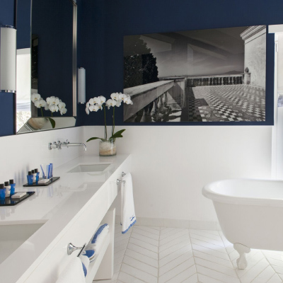 Our suite embodied everything one could expect from five star luxury and was nothing short of impressive. The suite itself was a wash of white, and included a separate living area to the bedroom, as well as an outdoor terrace complete with garden furniture. The terrace really was the most wonderful place to enjoy a morning coffee and take in the stunning sea views. The bathroom was huge and offered a roll-top bath and separate walk-in drench style shower, as well as his and hers wash basins. There was an abundance of thick, fully towels and robes, which were an absolute joy to use. The colour palette of our room was simply beautiful, with the bathroom being painted a deep dark blue that was rather opulent, especially in contrast to the selection of black and white photography adorning the walls.